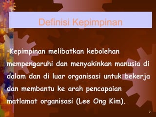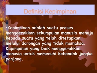 Kepimpinan dapat didefinisikan sebagai proses mempengaruhi orang lain untuk mencapai tujuan yang telah ditetapkan melalui dorongan yang tidak memaksa. Kepimpinan efektif melibatkan penyediaan visi jelas, strategi yang tepat, dukungan pasukan, motivasi, pengawasan, dan pencapaian tujuan. Gaya kepimpinan berbeza antara demokratik, otokratik, dan laissez-faire, dengan m