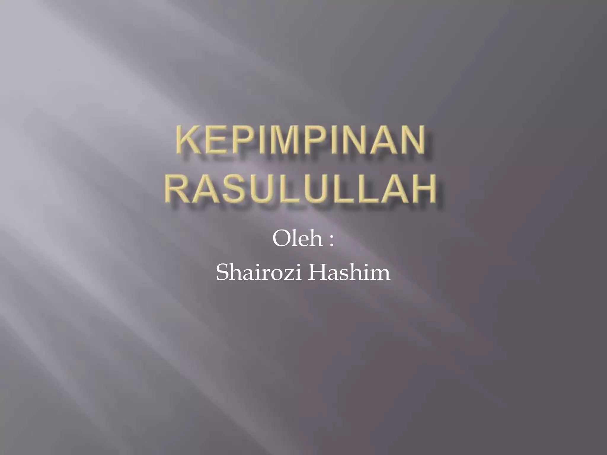 Nabi Muhammad adalah contoh pemimpin sejati. Beliau menunjukkan sifat-sifat kepimpinan yang mulia seperti sabar, adil, jujur, bijaksana, bertanggungjawab, ramah mesra dengan rakyat, tegas pendirian dan rela berkorban demi agama. Beliau berjaya menyatukan suku-suku Arab dan membangunkan masyarakat secara menyeluruh.