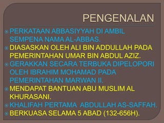 Dokumen ini membahas sejarah Dinasti Abbasiyah, yang diasaskan oleh Ali bin Abdullah, berkuasa selama lima abad dan dikenal sebagai zaman keemasan Islam. Banyak khalifah penting seperti Abu Abbas Al-Saffah dan Harun Al-Rasyid menciptakan kemajuan dalam ilmu pengetahuan dan ekonomi, namun akhirnya mengalami kemerosotan akibat serangan Mongol. Kekuatan pada zaman ini ditandai dengan pusat perdagangan dan ilmu pengetahuan yang pesat di Baghdad.