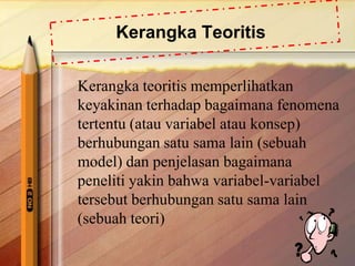 Dokumen tersebut membahas kerangka teoritis penelitian, termasuk jenis-jenis variabel (dependent, independent, moderating, mediating), langkah-langkah membangun kerangka teoritis, dan implikasi manajerial. Kerangka teoritis memperlihatkan hubungan antar variabel dan penjelasan mengapa variabel berhubungan, sedangkan hipotesis adalah proposisi yang dapat diuji secara empiris mengenai hubungan antar variabel.