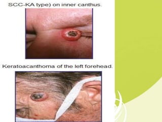 This document provides information on keratoacanthoma, a benign skin tumor that originates in hair follicles. It discusses the epidemiology, risk factors, clinical features, signs and symptoms, histopathology, differential diagnosis, investigations, management and treatment options. Keratoacanthoma typically presents as a rapidly growing nodule on sun-exposed skin and can resolve spontaneously within months, though complete excision is the treatment of choice.