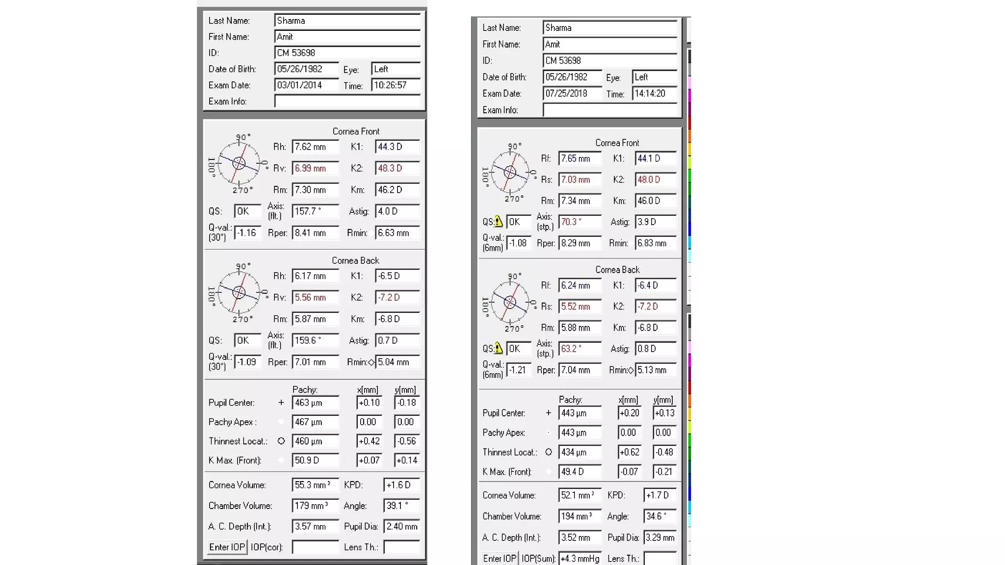 This document discusses the management of a 31-year-old male patient with bilateral asymmetric keratoconus that is more severe in the right eye. The right eye has stage IV keratoconus while the left eye has stage I. Deep anterior lamellar keratoplasty was performed on the right eye 4 years ago with good results. The left eye is being observed for progression. Parameters like corneal thickness, maximum keratometry, and anterior/posterior elevation have remained stable in the left eye over 4 years of follow-up based on global consensus recommendations for determining keratoconus progression. The limitations of the Amsler-Krumeich classification system for keratoconus are also discussed.