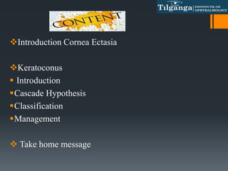 This document discusses ectatic disorders of the cornea, focusing on keratoconus. It defines keratoconus as a non-inflammatory thinning of the cornea that results in a protrusion and irregular astigmatism. The document covers the cascade hypothesis of oxidative damage in keratoconus pathogenesis, classification systems for keratoconus severity, signs and symptoms, and non-surgical management approaches like spectacles, contact lenses, and RGP fitting philosophies. The goal of management is to eliminate irregularities and provide optimal vision correction while minimizing further corneal damage.