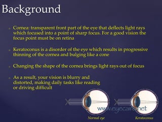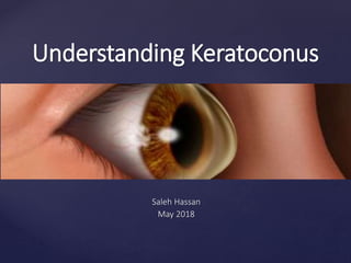Keratoconus is a progressive disorder that causes thinning and distortion of the cornea, resulting in blurry and distorted vision, often affecting both eyes differently. Diagnosis involves assessing the curvature, thickness, and cone morphology of the cornea, with treatment options ranging from corrective lenses to surgical procedures like corneal inserts and transplants. Collagen cross-linking is a promising procedure aimed at stabilizing the cornea and preventing further progression, with a high success rate but some associated risks.