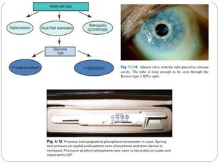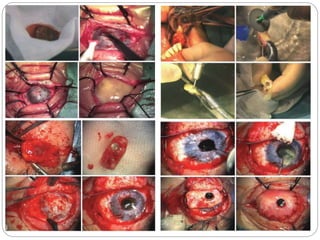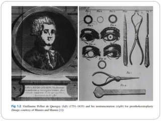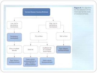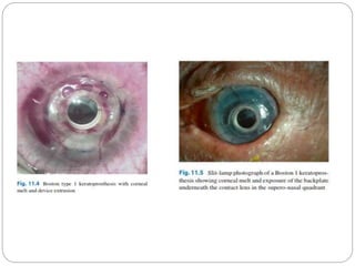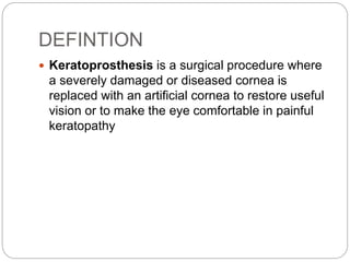 Keratoprosthesis is a surgical procedure that replaces a severely damaged or diseased cornea with an artificial cornea to restore vision. The first attempts at keratoprosthesis in humans date back to the mid-19th century, but most implants failed. Modern keratoprosthesis designs like the Boston KPro and AlphaCor KPro sandwich a donor corneal graft between plastic plates. Complications can include melting/extrusion of the implant, infection, glaucoma, retinal detachment, and formation of membranes behind the implant. Close post-operative monitoring is required to manage complications and maintain vision with keratoprosthesis implants.