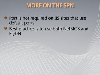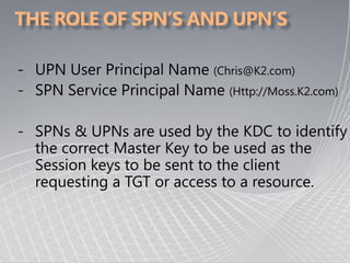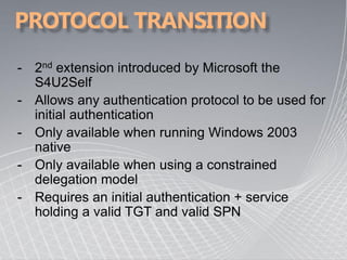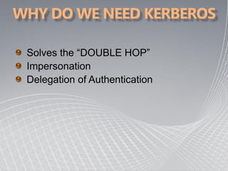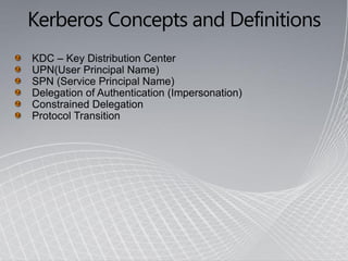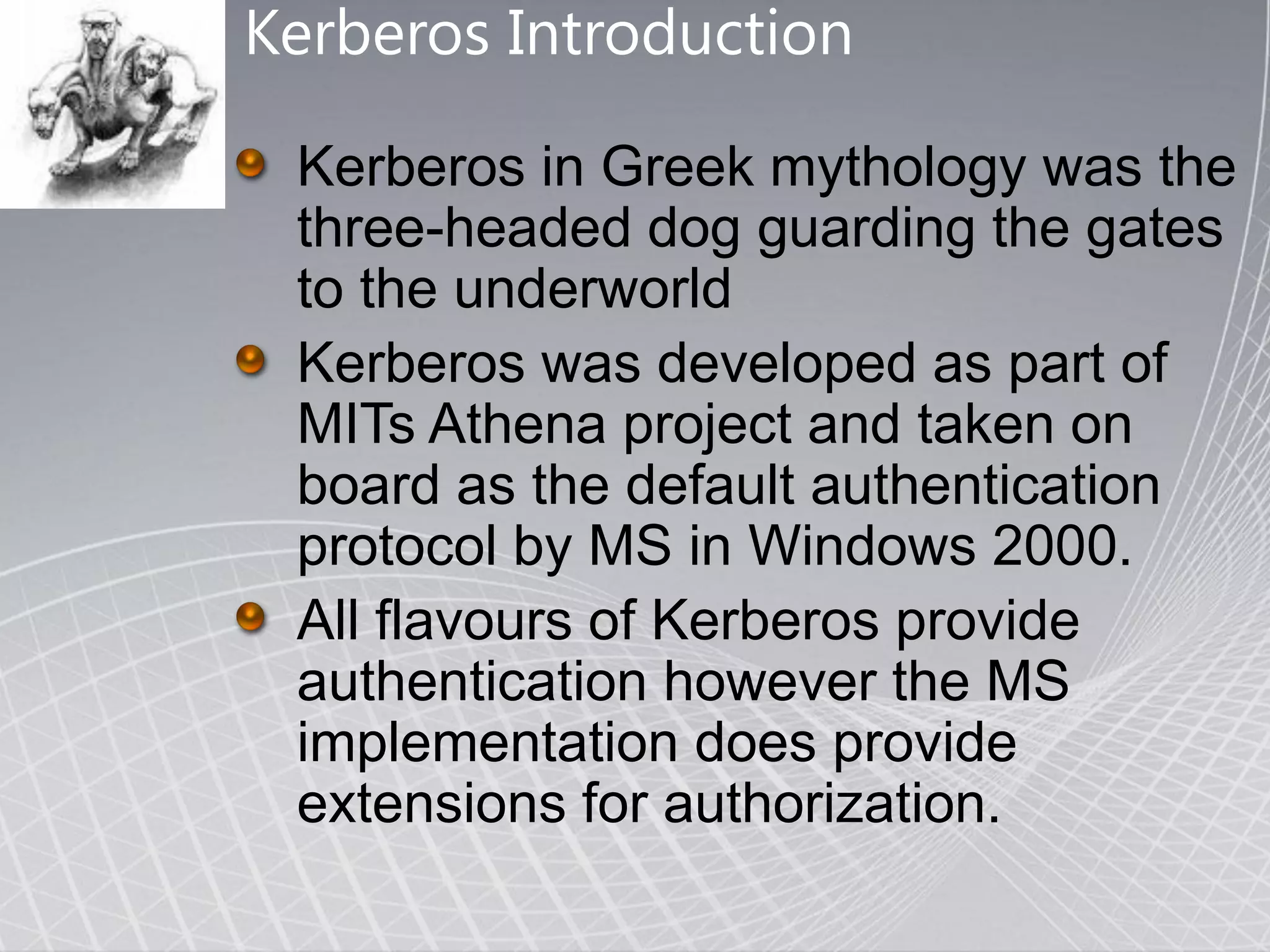 This document provides an overview of Kerberos authentication, including: