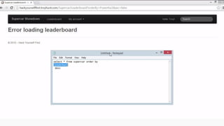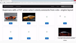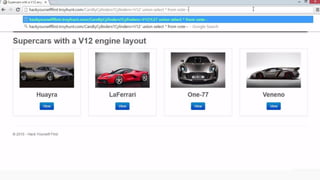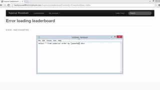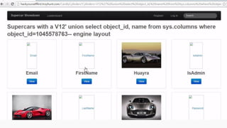 This document provides an overview of SQL injection, including what it is, how it works, different types of SQL injection methods, ways to prevent SQL injection, and examples of exploiting SQL injection vulnerabilities. Specifically, it defines SQL injection as injecting malicious code that gets executed by the backend SQL server, explains how attackers can access unauthorized data or modify database objects by manipulating SQL queries, covers error-based, union-based, blind, and time-based SQL injection techniques, and recommends validating untrusted data, implementing proper error handling, using query parameterization and stored procedures to prevent SQL injection vulnerabilities.