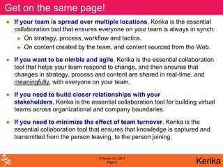 Kerika is a visual collaboration tool designed to keep teams in sync across multiple locations, facilitating real-time communication on strategy, workflow, and content management. It allows users to share ideas, plans, and various forms of content seamlessly within an interactive whiteboard format, enhancing agility and responsiveness to change. Additionally, it supports team management and collaboration with real-time updates, encryption for security, and integration with tools like Google Docs.
