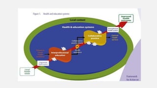 Dokumen ini membahas pentingnya kerja sama antar profesi dalam meningkatkan kualitas pelayanan kesehatan di Indonesia, yang saat ini tertekan oleh kekurangan tenaga kesehatan dan tingginya harapan masyarakat akan pelayanan yang baik. Kerjasama ini harus dilandasi oleh tujuan yang jelas, komitmen bersama, peran yang terdefinisi, dan saling ketergantungan antar profesi untuk mencapai hasil optimal bagi pasien. Selain itu, faktor-faktor yang mempengaruhi kolaborasi antarprofesi juga diidentifikasi untuk meningkatkan efektivitas tim dalam pelayanan kesehatan.
