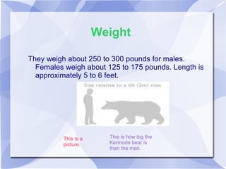 The Kermode bear is a subspecies of the American black bear found in coastal British Columbia. They weigh between 125-300 pounds and are 5-6 feet in length. Their population is estimated at under 1300. Kermode bears eat a variety of vegetation, fruits, fish and small animals. Approximately 10% have pure white fur which helps camouflage them in the dense, dark forests they inhabit. They are considered spirit bears in local indigenous cultures and seen as symbols of past hardships. Major threats to their survival include habitat loss from logging and changes to their ecosystem from climate change.