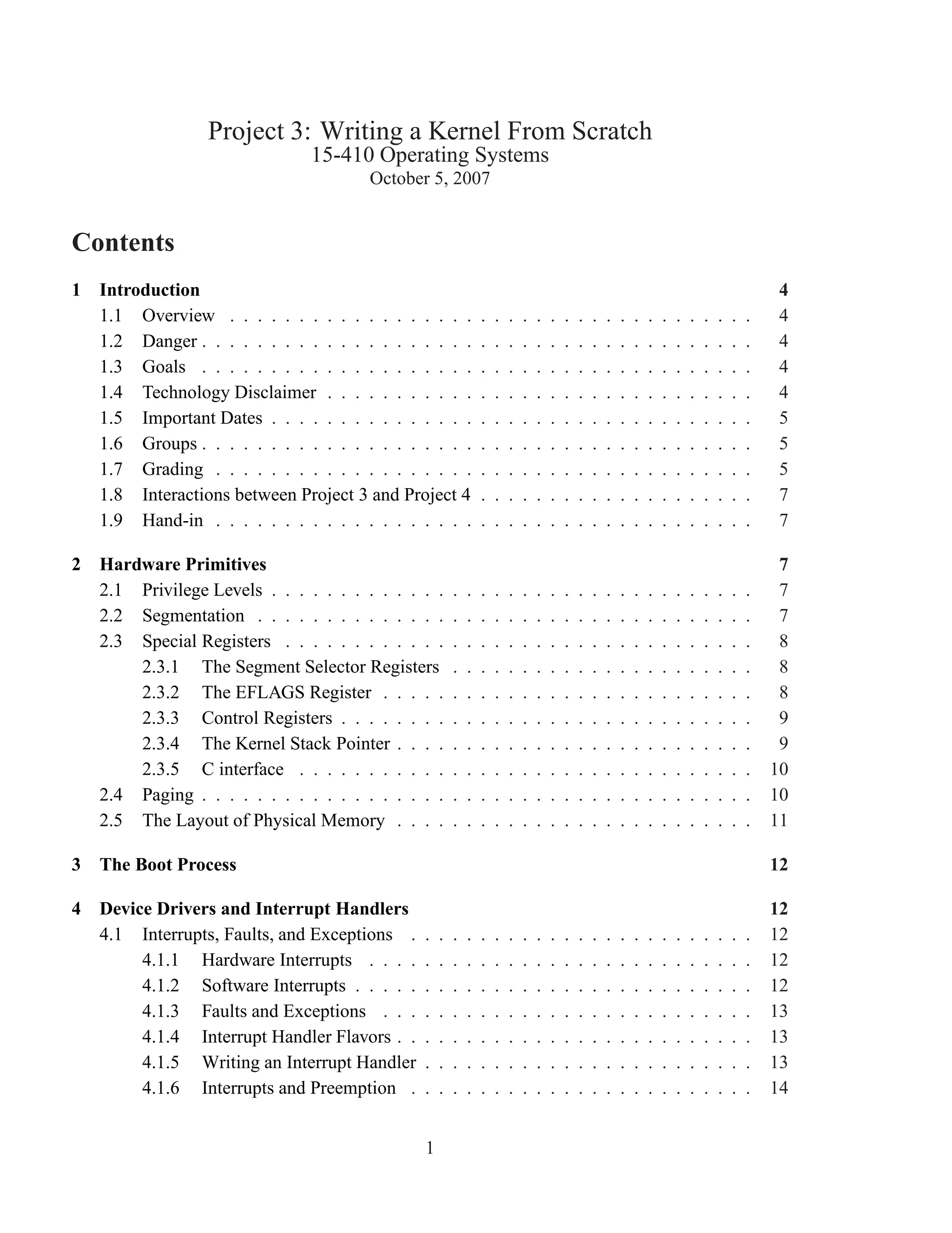 This document outlines the goals and requirements for Project 3, which involves writing a kernel from scratch. It discusses hardware primitives, the boot process, device drivers, context switching, scheduling, system calls, building and loading user programs, the programming environment, hints for implementing a kernel, and debugging strategies. The project involves implementing an operating system kernel that supports interrupts, scheduling, and basic system calls.