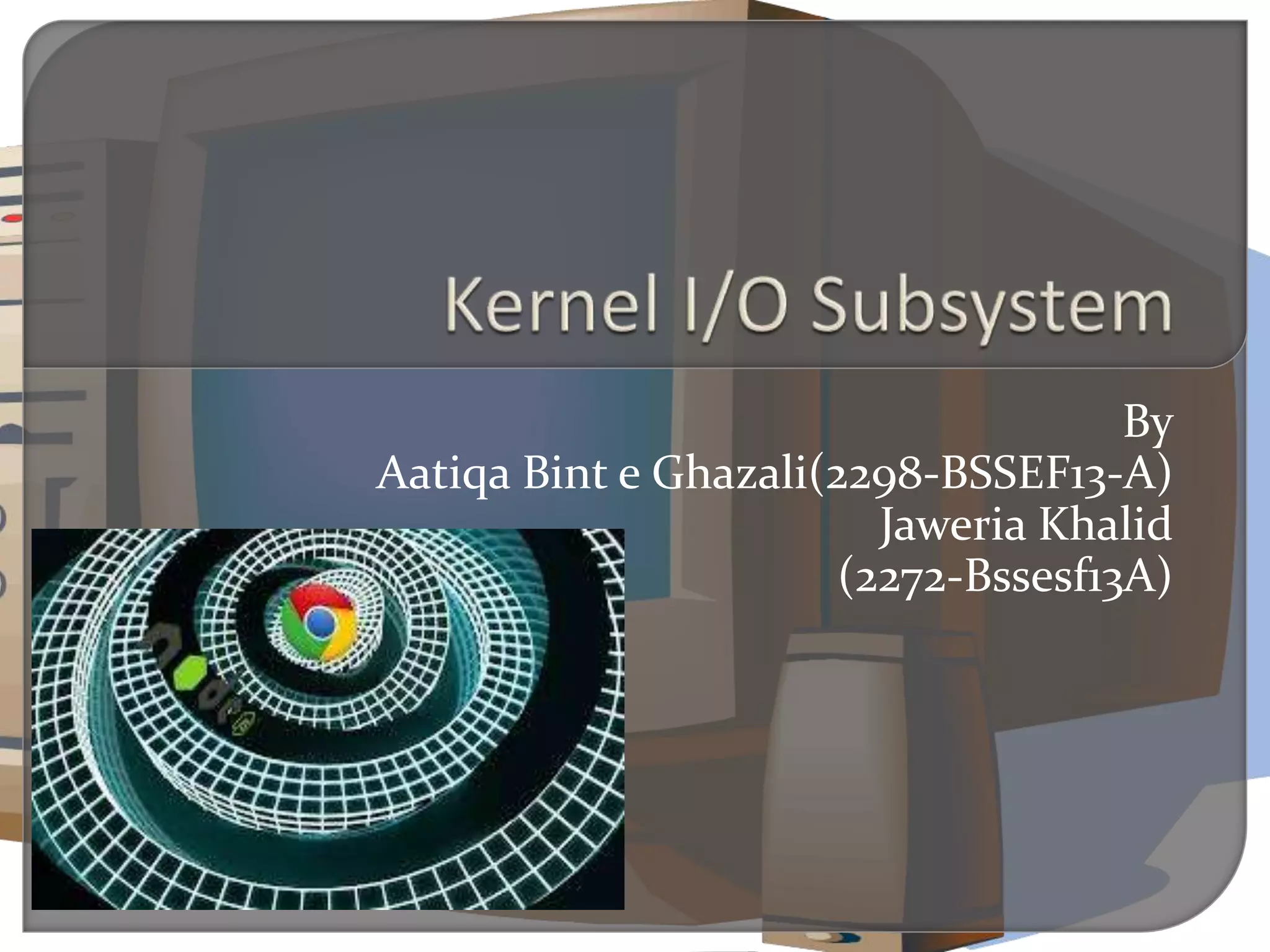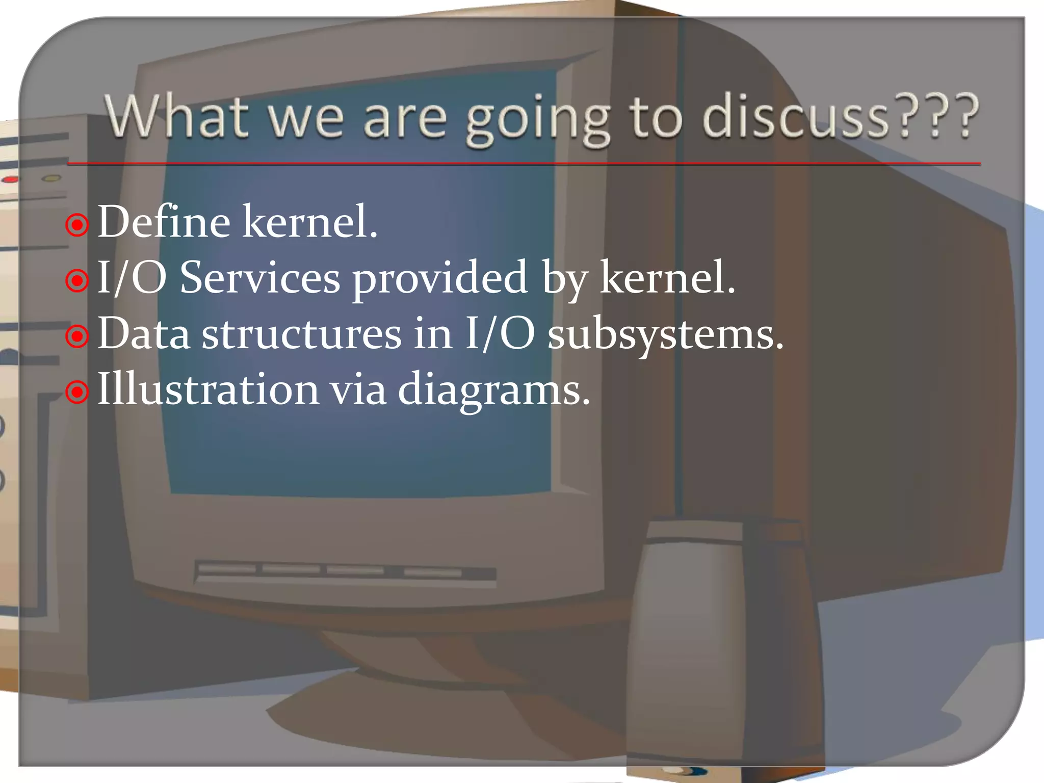 The document defines the kernel as the core of an operating system that provides basic services for I/O. It discusses I/O services provided by the kernel like scheduling, buffering, caching, spooling, device reservation, error handling, and I/O protection. The document also describes data structures like open file tables that the kernel uses to track the state of I/O components and activities.