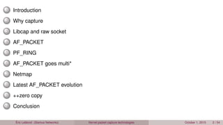 The document discusses kernel packet capture technologies and their evolution, focusing on methods such as raw sockets, libpcap, af_packet, pf_ring, and netmap. It highlights the significance of network intrusion detection systems like Suricata and challenges faced in high-speed traffic inspection. The author emphasizes the need for advancements in packet capture architecture to handle increasing network speeds efficiently.