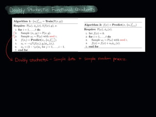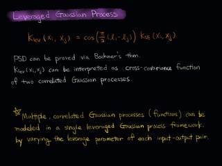 The document discusses leveraged Gaussian process regression, emphasizing its ability to anchor positive training data while avoiding negative data. It introduces a sparse constrained leverage optimization approach to handle the challenges associated with the number of leverage parameters, proposing new methods for more accurate optimization. Additionally, it outlines applications in sensory field reconstruction and autonomous driving experiments, highlighting the advantages of these techniques.