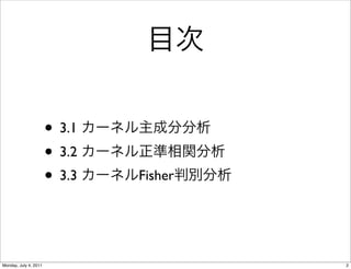 The document discusses several machine learning techniques including principal component analysis (PCA), kernel PCA, linear discriminant analysis (LDA), and canonical correlation analysis (CCA). It explains how these techniques can be applied in reproducing kernel Hilbert spaces (RKHS) and compares their uses for dimensionality reduction and finding correlations between paired datasets. Several references are provided for further reading on applications of these methods.