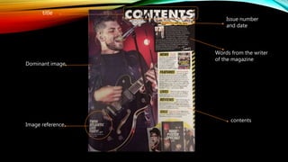 The document analyzes the layout and design elements of the contents page of a music magazine called Kerang!. It discusses the purpose and placement of key elements like the issue number, date, title, dominant image, image reference, section headings for contents, and a quote from the magazine writer. These elements are designed to identify the issue, attract readers to specific articles, give photo credit legally, and help readers easily navigate to content that interests them.