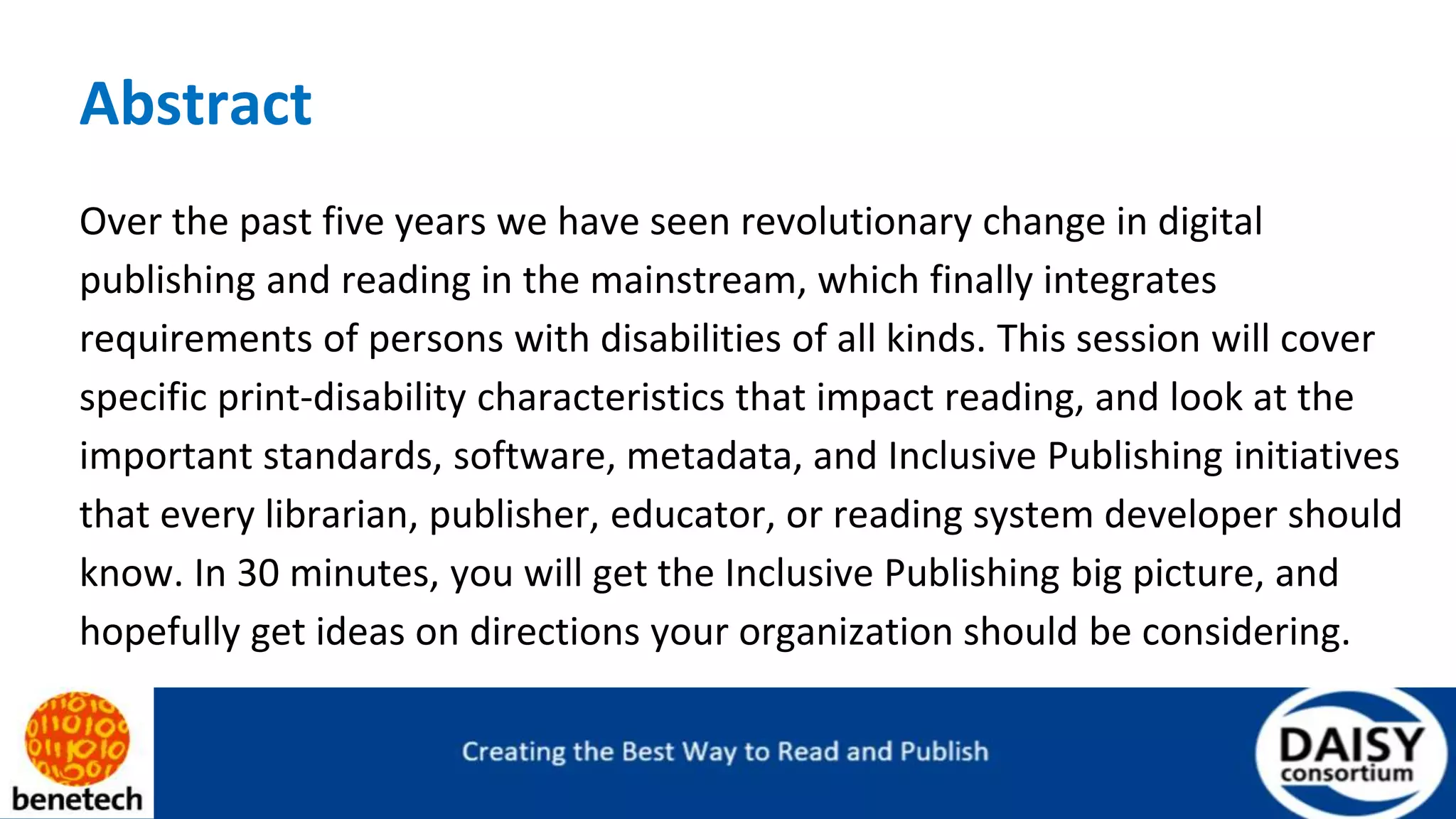 The document discusses the importance of accessibility in digital publishing for individuals with disabilities, highlighting key standards, software, and inclusive publishing practices that educators, librarians, and publishers should implement. It covers the advantages of EPUB 3 for accessibility, including features tailored for various disabilities, and emphasizes the need for proper metadata to enhance discovery and procurement of accessible content. The author calls for libraries and publishers to adopt accessible practices and urges the need for inclusion in the publishing industry.