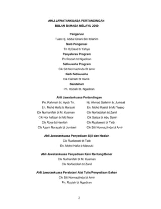 Dokumen tersebut merangkum program Bulan Bahasa Melayu tahun 2009 di SMK Tan Sri Jaafar Albar. Program tersebut bertujuan untuk meningkatkan kemahiran berbahasa Melayu pelajar melalui berbagai pertandingan seperti pidato, menulis esai, forum dan sajak. Acara tersebut diikuti pelajar dari tingkatan satu hingga enam dan diselenggarakan pada bulan Februari hingga Maret 2009.