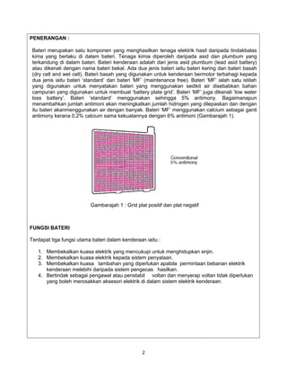 Dokumen ini membincangkan tentang bateri kenderaan yang merupakan komponen penting dalam sistem elektrik kenderaan, termasuk jenis-jenisnya seperti bateri standard dan bateri maintenance free. Ia menerangkan fungsi, struktur asas, dan tindakbalas kimia yang berlaku dalam bateri semasa cas dan luput cas. Pelajar diharapkan dapat memahami cara penjagaan, penyelenggaraan, dan perbezaan jenis bateri serta sistem elektrik di dalam kenderaan.