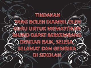 Dokumen tersebut membahas tentang faktor-faktor yang menyebabkan buli di sekolah seperti faktor keluarga, individu, sekolah, media massa, dan rakan sebaya. Dokumen tersebut juga menyarankan tindakan yang dapat diambil guru seperti menyiasat aduan buli, memberikan pendidikan agama, dan meningkatkan pengawasan di sekolah.