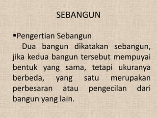Dokumen ini menjelaskan tentang kesebangunan dan kongruensi dua bangun datar. Dua bangun dikatakan sebangun jika bentuknya sama tetapi ukurannya berbeda, sedangkan dua bangun dikatakan kongruen jika memiliki bentuk dan ukuran yang sama. Syarat untuk kedua konsep ini termasuk kesamaan sudut dan perbandingan sisi yang setara.
