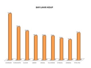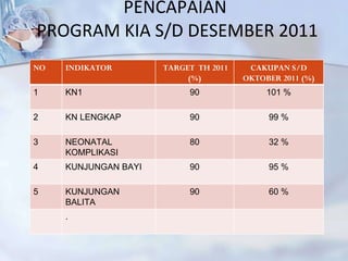 Evaluasi kegiatan di Dinas Kesehatan Kota Cilegon menunjukkan pencapaian program KIA yang bervariasi hingga Desember 2011, dengan cakupan kunjungan bayi dan balita yang tidak mencapai target. Kematian neonatal dan balita tercatat 17 kasus pada bulan ini, dengan beberapa penyebab yang diidentifikasi. Data kematian bayi dari tahun 2006 hingga 2009 menunjukkan fluktuasi, sementara target Angka Kematian Bayi (AKB) diharapkan menurun.