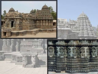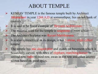 The document provides details about the Keshava Temple located in Somanathapura and the Chennakesava Temple located in Belur. It describes the architectural features of both temples, noting they were built in the finest Hoysala style using soapstone. The Somanathapura temple was built in 1268 AD and has a star shaped plan with three shrines and intricately carved sculptures. The Belur temple was built by King Vishnuvardhana to commemorate his victory and contains a central pillared hall with beautifully carved pillars and ceilings.