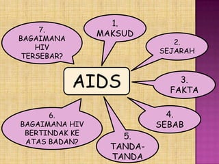 Dokumen ini membahas tentang AIDS. Topik utama meliputi definisi AIDS, sejarah penemuan virus HIV, statistik kasus AIDS global, penyebab AIDS adalah virus HIV, gejala-gejala AIDS, bagaimana HIV bekerja di tubuh, dan cara penularan HIV seperti melalui darah tercemar, jarum suntik, dan dari ibu ke anak. Dokumen ini menyimpulkan bahwa AIDS dapat dicegah dengan menjalani gaya hidup sehat dan taat pada ajaran agama.