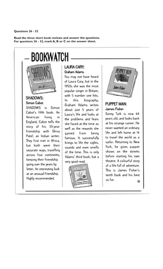 This document contains instructions and questions for a reading and writing quiz. It instructs students to use a pen, not a pencil, and provides time estimates. It also lists forbidden actions during the test, such as making stains or drawings, asking questions about content, or using mobile phones. The main part of the quiz contains 14 multiple choice questions where students must choose between "so --- I" or "neither --- I" to complete sentences based on a short conversation with Jenny describing something that is true for both them and her.