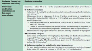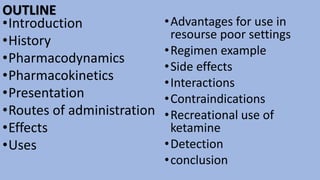 This document provides an overview of ketamine, including its history, pharmacology, effects, uses, and advantages for resource-poor settings. Some key points: