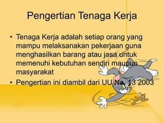 Dokumen ini membahas pengertian tenaga kerja dan kesempatan kerja serta dampak negatif pengangguran. Tenaga kerja dibagi menjadi angkatan kerja dan bukan angkatan kerja, sementara kesempatan kerja mencakup berbagai sektor ekonomi. Upaya pencegahan pengangguran meliputi peningkatan pendidikan dan informasi lowongan kerja dari pemerintah.