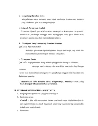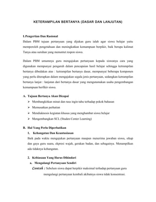 Dokumen ini membahas tentang keterampilan bertanya guru dalam proses pembelajaran. Terdapat dua jenis keterampilan bertanya yaitu dasar dan lanjutan. Keterampilan bertanya dasar meliputi penyampaian pertanyaan yang jelas, memberikan acuan, dan memusatkan perhatian siswa. Sedangkan keterampilan bertanya lanjutan bertujuan meningkatkan kemampuan berpikir siswa dengan mengubah tingkat kognitif pertanyaan dan men