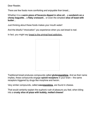 This document warns against the health risks associated with traditional bread and wheat consumption, emphasizing how they can lead to weight gain, chronic inflammation, and autoimmune diseases due to compounds like gluteomorphins and lectins. The author argues that even gluten-free breads may not be a safe alternative, as they often contain harmful ingredients and can spike blood sugar levels similarly to wheat. Ultimately, it offers a solution for enjoying bread without health concerns, suggesting it is possible to indulge in bread while maintaining wellbeing.