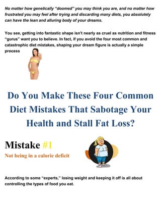 This document summarizes a marketing email promoting a custom keto meal plan service. It begins by outlining common diet mistakes like not being in a calorie deficit, severe calorie restriction, thinking all calories are equal, and following unrealistic diets. It then promotes a custom keto meal plan service claiming it avoids these mistakes and allows enjoyable eating while losing fat through ketosis. The service provides 8 weeks of customized meals, recipes, and grocery lists for under $40, with a money back guarantee if unsatisfied.