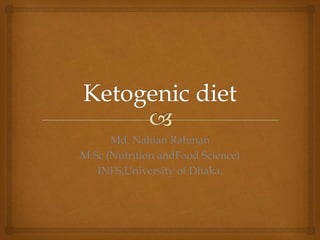 The document discusses the ketogenic diet, which is a high-fat, low-carbohydrate diet used to treat intractable epilepsy. It aims to decrease seizures by putting the body into a state of ketosis. The diet has shown to be effective in reducing seizures in 38% of patients after 3 months compared to 6% of control patients. It can be implemented as a classical 4:1 or 3:1 ratio diet, or as a medium chain triglyceride diet, with no difference in efficacy between the two. Strict monitoring of growth, blood tests, seizures and ketone levels is needed when a patient is on the ketogenic diet.