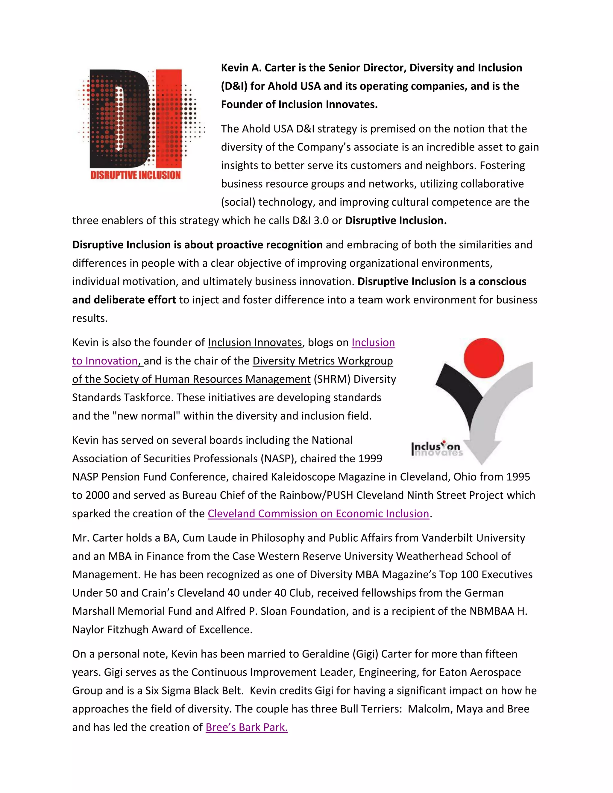 Kevin A. Carter is the Senior Director of Diversity and Inclusion at Ahold USA and its operating companies, and is the founder of Inclusion Innovates. The Ahold USA D&I strategy aims to utilize its diverse associates to better serve customers by fostering business resource groups, utilizing collaborative technology, and improving cultural competence. Known as "Disruptive Inclusion", this strategy seeks to proactively recognize both similarities and differences in people to improve work environments, motivation, and innovation. Kevin also chairs diversity initiatives at the Society of Human Resources Management to develop new standards for the field of diversity and inclusion.