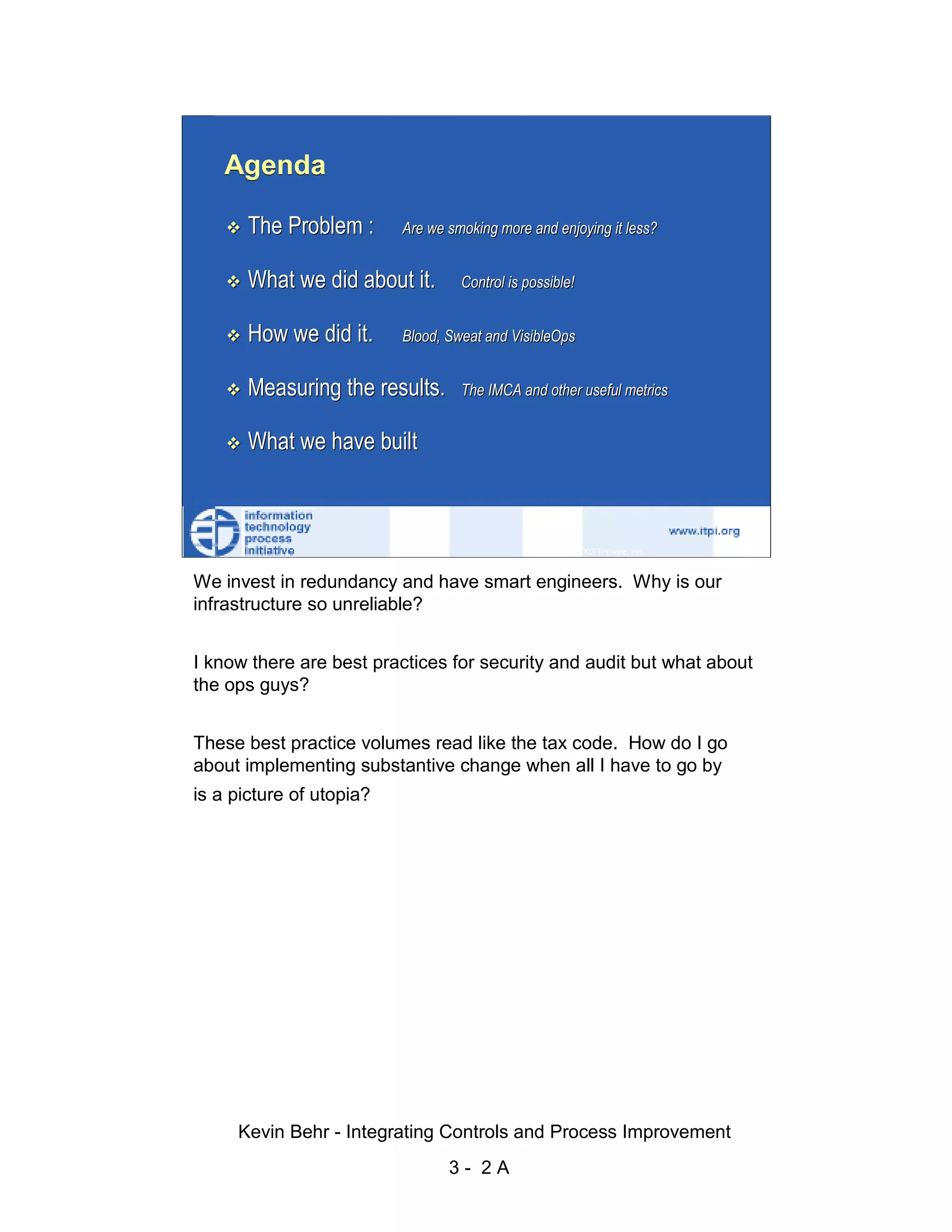 The document discusses integrating controls and process improvement. It notes that human-caused changes are responsible for 78% of system outages. The current approach does little to address this problem. The organization implemented a framework called ITIL and methodology called Visible Ops to better integrate controls and improve processes. This aims to increase operational efficiencies, service levels, and reduce problem resolution times through preventative and detective controls.