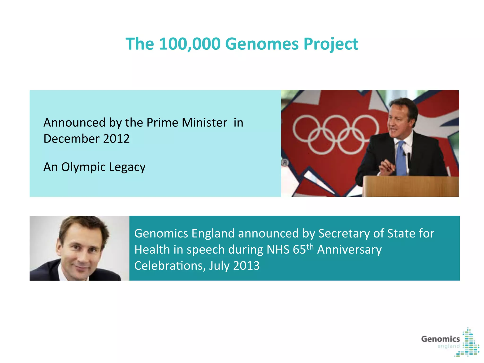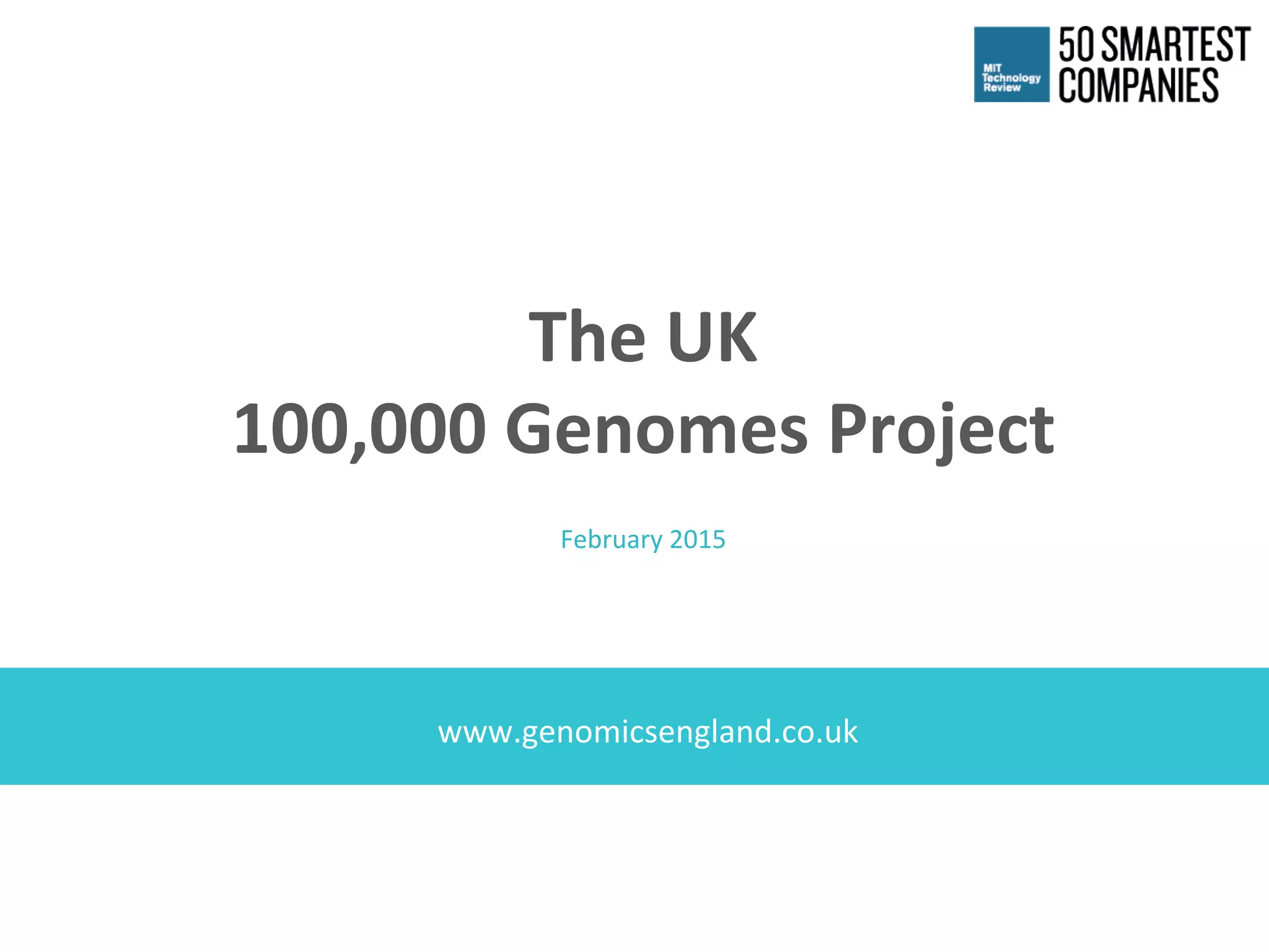 The document describes the UK 100,000 Genomes Project, which aims to sequence 100,000 genomes from NHS patients by 2017. It will provide benefits to patients through new treatments and insights, contribute to the UK economy through commercial activity in genomics, and help integrate genomic medicine into clinical practice in the NHS. Genomics England was established to lead the project and work with partners including NHS England, 11 Genomic Medicine Centres, and commercial companies. The project involves genome sequencing, analysis, and returning results to clinicians to inform treatment.