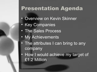 Kevin Skinner is an experienced senior sales executive who has worked in the IT industry since 1993 and the ECM/EDM industry since 2004. He has worked for several companies including Sage resellers and Zylab, selling a variety of hardware and software solutions. This year he has already brought in over $675,000 in revenue, surpassing his targets. He believes his experience and track record of success, as well as his understanding of the ECM/EDM market and ability to generate innovative ideas, make him a strong candidate for any company. He outlines his sales process and goals, which include identifying key markets, setting achievable targets, and maintaining a pipeline to achieve $1.2 million in revenue.