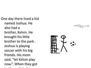 Joshua brought his younger brother Kelvin to the park to play soccer with his friends but did not want Kelvin to join in. When Kelvin started crying because he was not allowed to play, Joshua reluctantly agreed but warned Kelvin that his friends played rough. During the game, one of Joshua's friends tripped Kelvin, causing him to get a bump on his head and cry. Joshua helped make Kelvin's bump feel better. When they returned home, their mother was pleased that Joshua had let Kelvin play, saying Joshua would have been grounded if he had not.