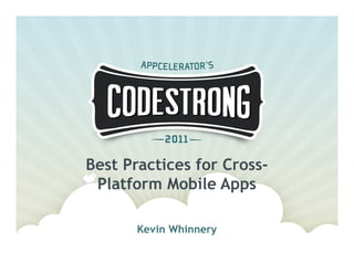 The document discusses best practices for developing cross-platform mobile applications, emphasizing the distinction between 'write once, run everywhere' and 'write once, adapt everywhere.' It covers the importance of understanding UI conventions for iOS and Android, and different strategies for component-oriented applications and modular JavaScript techniques. The document also outlines two primary approaches—platform identity and brand identity—highlighting their respective advantages and tradeoffs.