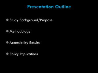 This document evaluates the accessibility and opportunities for transit-oriented development of proposed rail transit extensions in the Bay Area. It finds that the extensions would increase regional accessibility, especially for central cities and inner suburbs. The highest ranked extension is BART to Silicon Valley, while Caltrain to downtown SF adds value as a major activity center. Accessibility is one factor for transit-oriented development potential, and surrounding land use and proximity to jobs also impact opportunities.