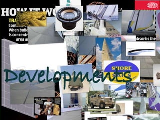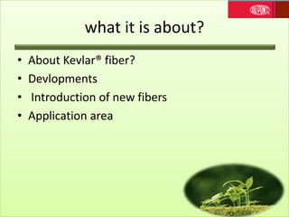 Kevlar fiber is a para-aramid fiber known for its high strength-to-weight ratio and cut resistance. Developments include new Kevlar fibers that are 15% stronger and reduce backface deformations. Kevlar is used in aerospace, marine, body armor, helmets, vehicles, oil/gas, and optics due to its light weight and high strength properties. New applications include liquid body armor using Kevlar sheets enclosing shear stress fluid and heat resistant gloves.
