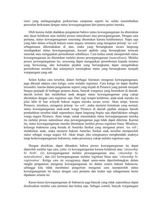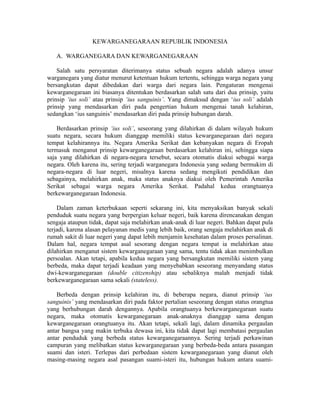 Dokumen ini membahas kewarganegaraan di Indonesia, menjelaskan prinsip 'ius soli' dan 'ius sanguinis' sebagai dasar pemberian status kewarganegaraan. Terdapat penekanan pada pentingnya pengaturan yang adil untuk mencegah dwi-kewarganegaraan dan statelessness, serta perlunya proses naturalisasi dan registrasi sebagai cara untuk memperoleh kewarganegaraan. Selain itu, isu etnisitas dan diskriminasi di antara warga keturunan di Indonesia juga disoroti, dengan harapan untuk memperkuat integrasi sosial tanpa memandang asal etnis.