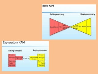 Key account management (KAM) is a systematic approach to managing and growing an organization's most important customers to maximize mutual value and achieve mutually beneficial goals. KAM focuses on building solid relationships with existing high-priority clients through a more holistic approach rather than just thinking of clients as sales opportunities. The goal of KAM is to ensure the long-term development and retention of strategic customers by providing solutions rather than just pushing products and helping customers buy rather than just selling to them. KAM solutions select key accounts based on Pareto's rule, focusing on the top 20% of accounts that will provide 80% of profits.