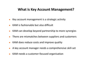 Key account management (KAM) is a strategic activity that aims to develop partnerships between suppliers and customers beyond simple transactions. It focuses on understanding customer needs and providing total solutions rather than just products and services. Effective KAM requires a comprehensive skill set from account managers and a customer-focused organization. Companies implement KAM to create win-win relationships and integrate their strategies and operations with key customers. Developing closer collaborative relationships through KAM can move the partnership from basic transactions to interdependent strategic planning that benefits both companies.