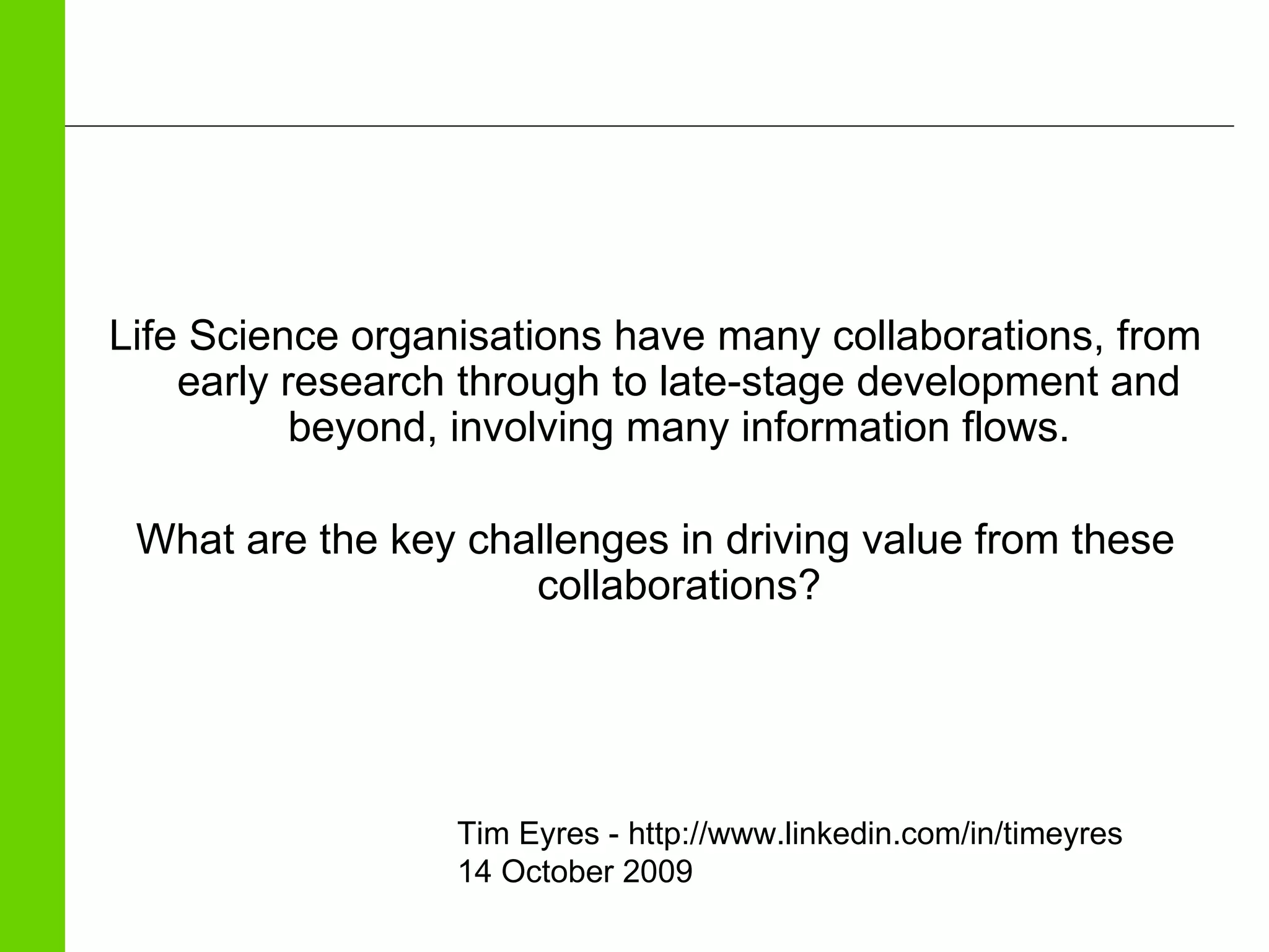 Life science organizations face many challenges in driving value from collaborations across research and development. These challenges include issues with security, diversity, culture, geography, and managing both structured and unstructured knowledge as collaborations involve early research, late-stage development, and continue after product release with feedback over many years.