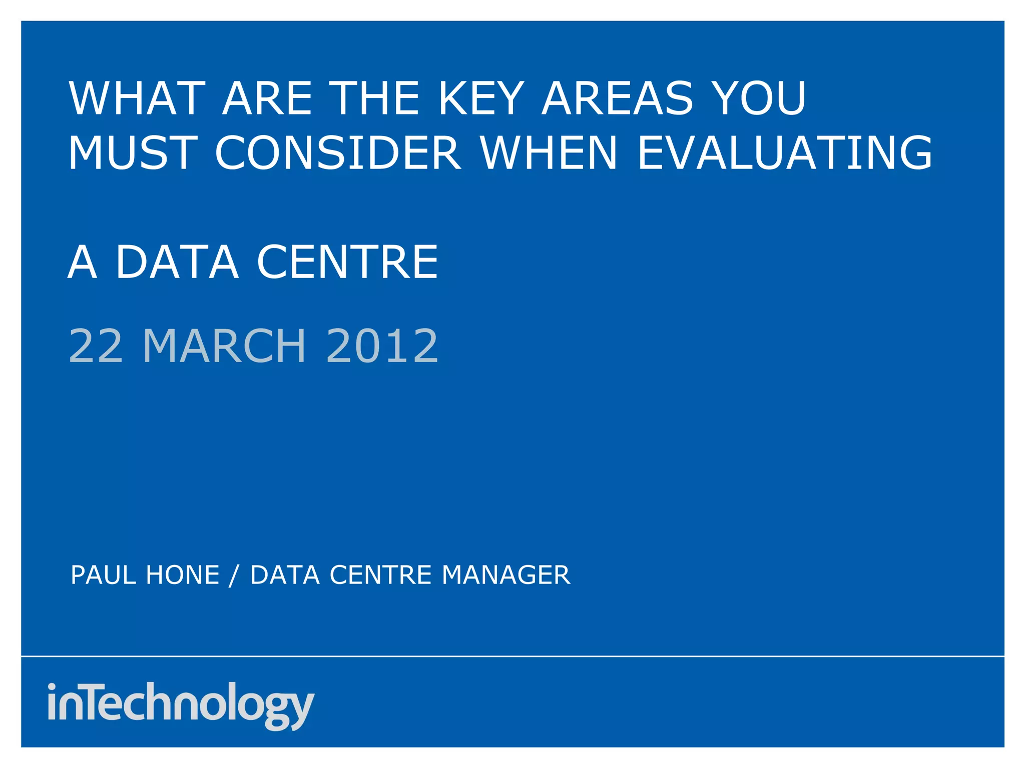 This webcast discusses key areas to consider when evaluating a data centre, including location, security, performance, reliability, scalability, and cloud credentials. Location factors include geographical diversity, flood risks, and proximity to major cities. Security focuses on physical access controls, backups, and network security. Performance centers on power availability, efficiency, and managing power consumption. Reliability examines aging infrastructure risks and benefits of an end-to-end provider. Scalability stresses the hybrid model of physical and cloud infrastructure for flexibility. Cloud credentials list self-service tools, licensing options, and support services.