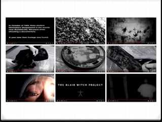 This trailer for The Blair Witch Project provides key information about the film's plot and genre. It establishes that three student filmmakers go missing in the woods near Burkittsville, Maryland in 1994 while shooting a documentary. Throughout black-and-white, shaky footage and close-ups, the audience gets clues about the students' investigation and experiences of fear. Sound effects of storms add to the unsettling atmosphere. Overall, the trailer leaves the audience wanting to know what happens to the students while effectively setting the scene for a thriller/horror film.