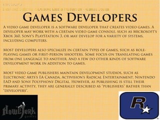 The computer games industry has a complex organizational structure. Large game development studios focus on creating games while publishers market and distribute the finished products to consumers. Independent developers and smaller studios also create games that are sometimes published or distributed by the larger companies in the industry.